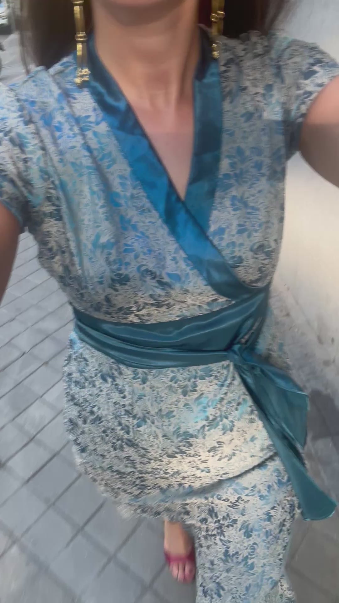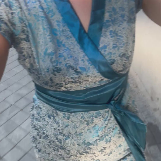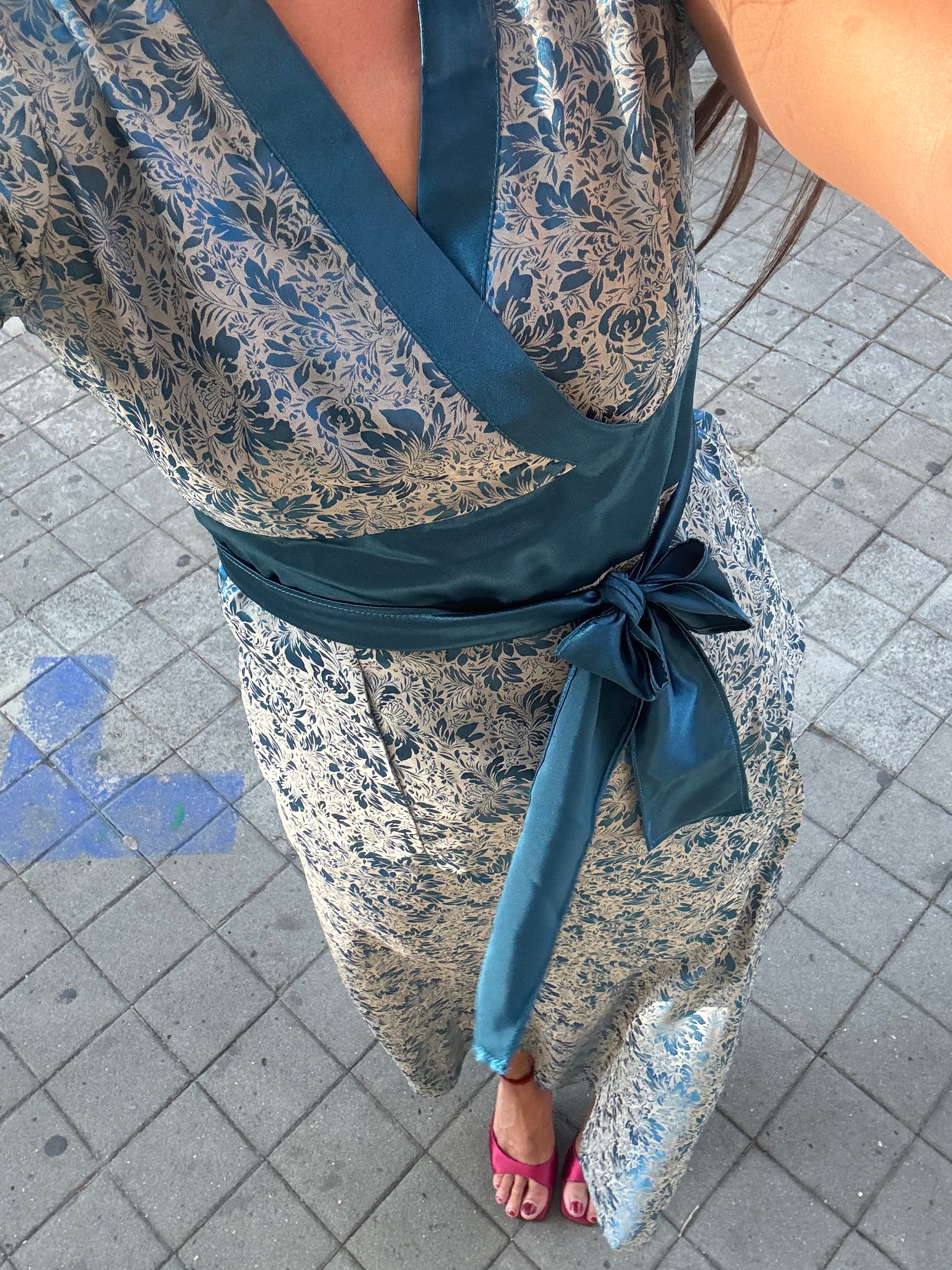 Conjunto compuesto por un top ajustable y una falda fluida midi de seda. El top, de manga corta y del mismo tejido que la falda, presenta una banda cosida justo debajo del pecho, integrada en la prenda, que enmarca la silueta y permite un ajuste personalizado. Esta banda se ata en la parte delantera mediante una lazada, lo que no solo realza la figura, sino que aporta un detalle visual atractivo y funcional.