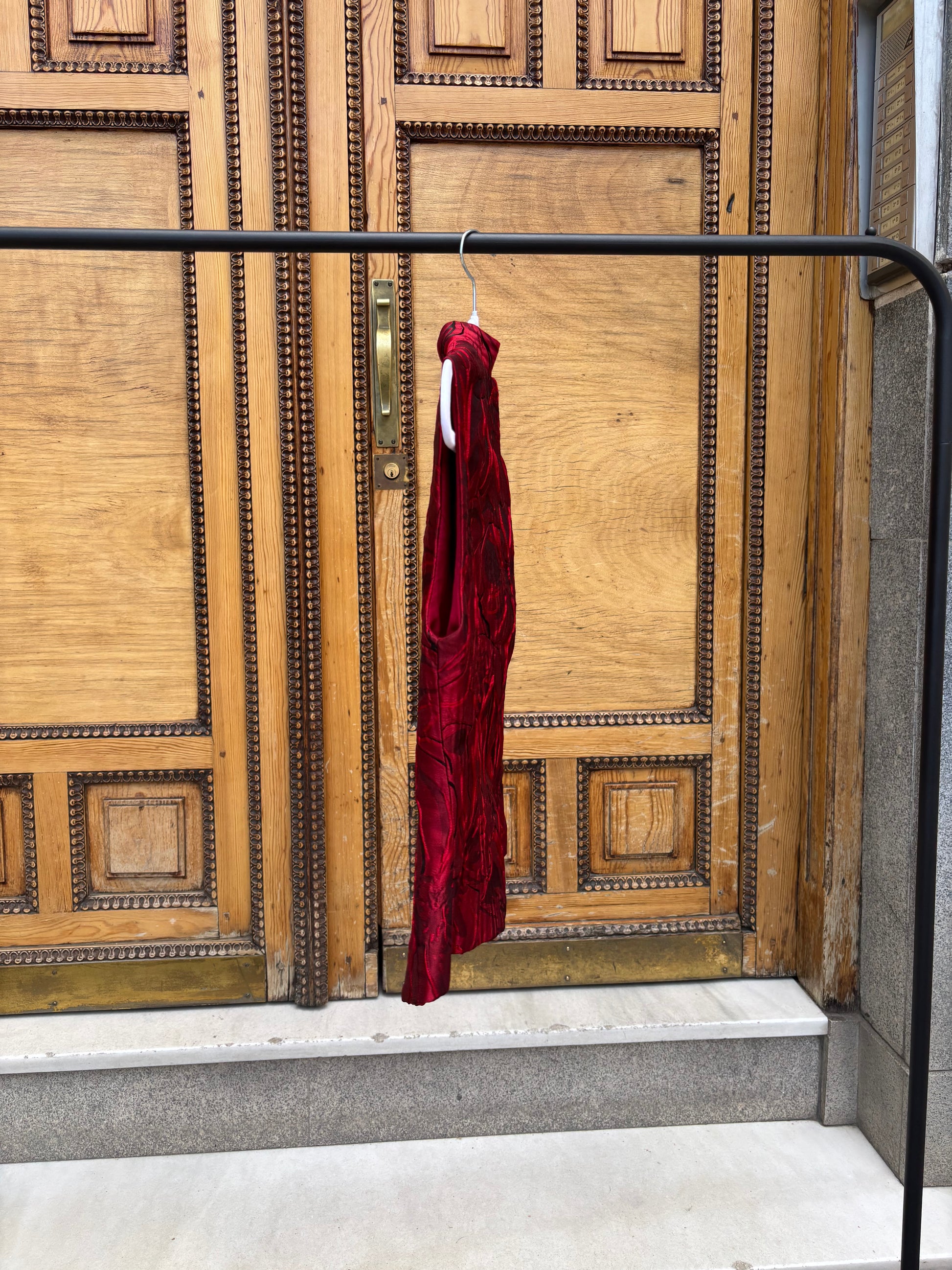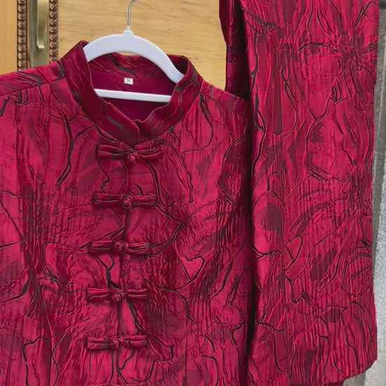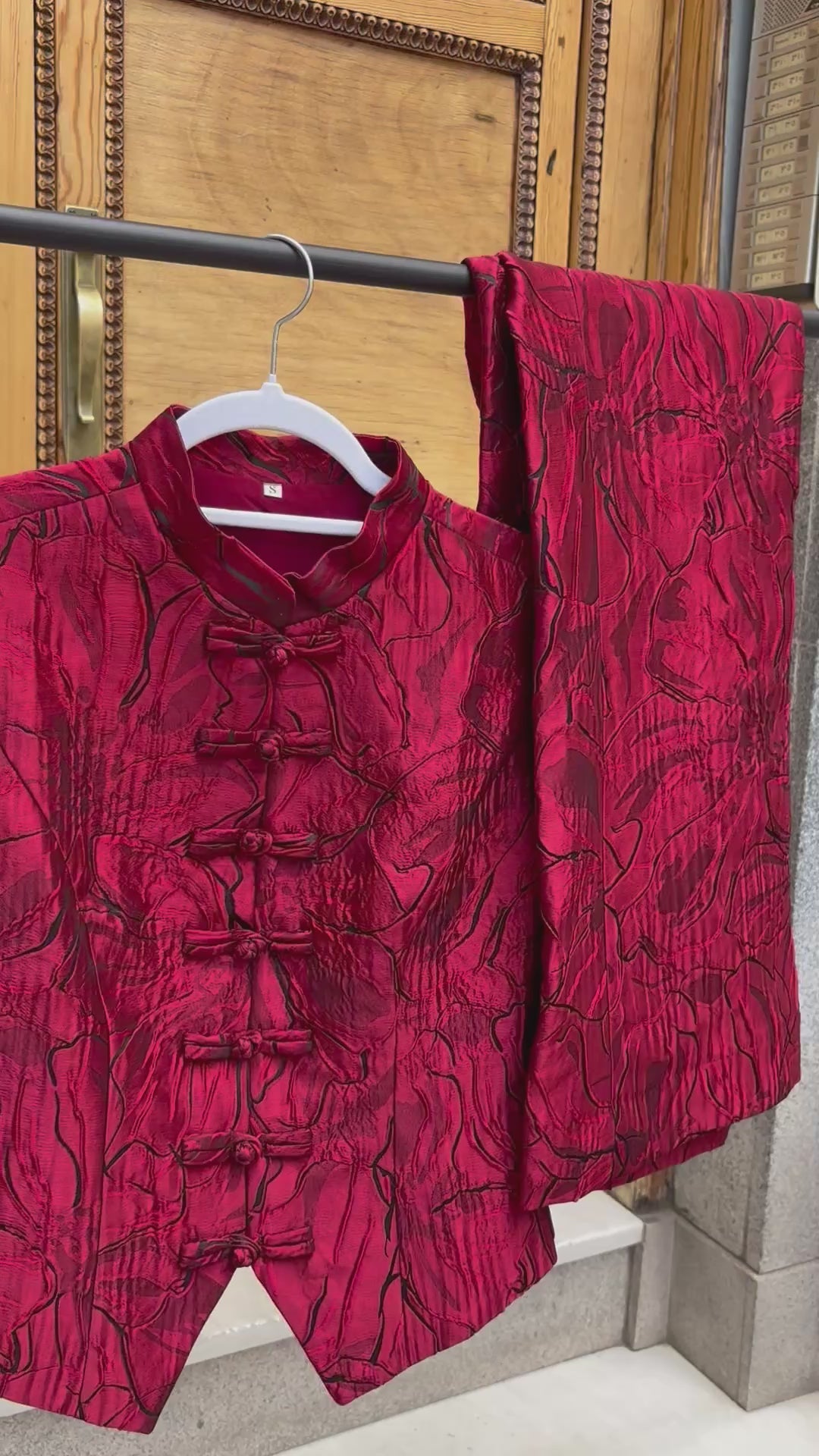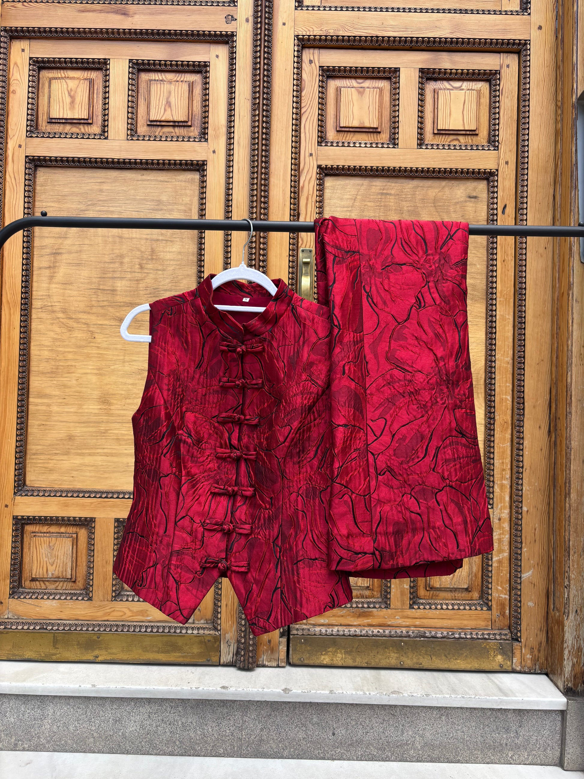 Conjunto confeccionado en seda, compuesto por un chaleco rojo de con ligeros toques en negro. El chaleco incluye un forro interior, pensado para brindar comodidad y un acabado refinado. El pantalón, confeccionado en la misma tela de seda roja, no cuenta con forro, permitiendo que se adapte al cuerpo con naturalidad. Su diseño termina en una ligera campana en la parte inferior, aportando un toque estilizado y moderno.