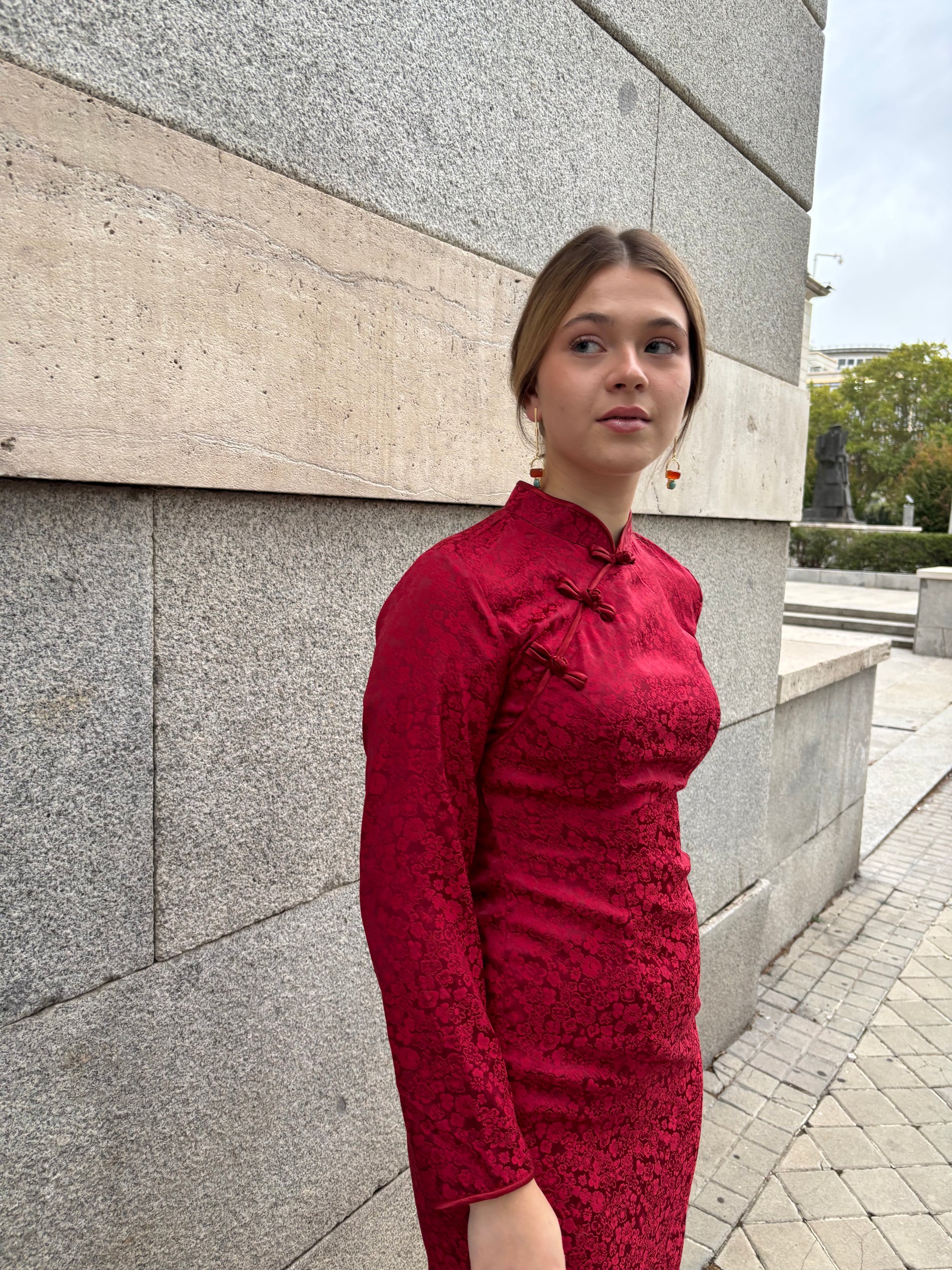El vestido AMORETTA estilo quipao en color rojo está confeccionado en un delicado estampado de seda floral, con cuello mao y una elegante hilera de botones orientales en el pecho. Su caída fluida y manga larga aportan comodidad. Este vestido es perfecto para la temporada otoño/invierno y no tiene forro interior.