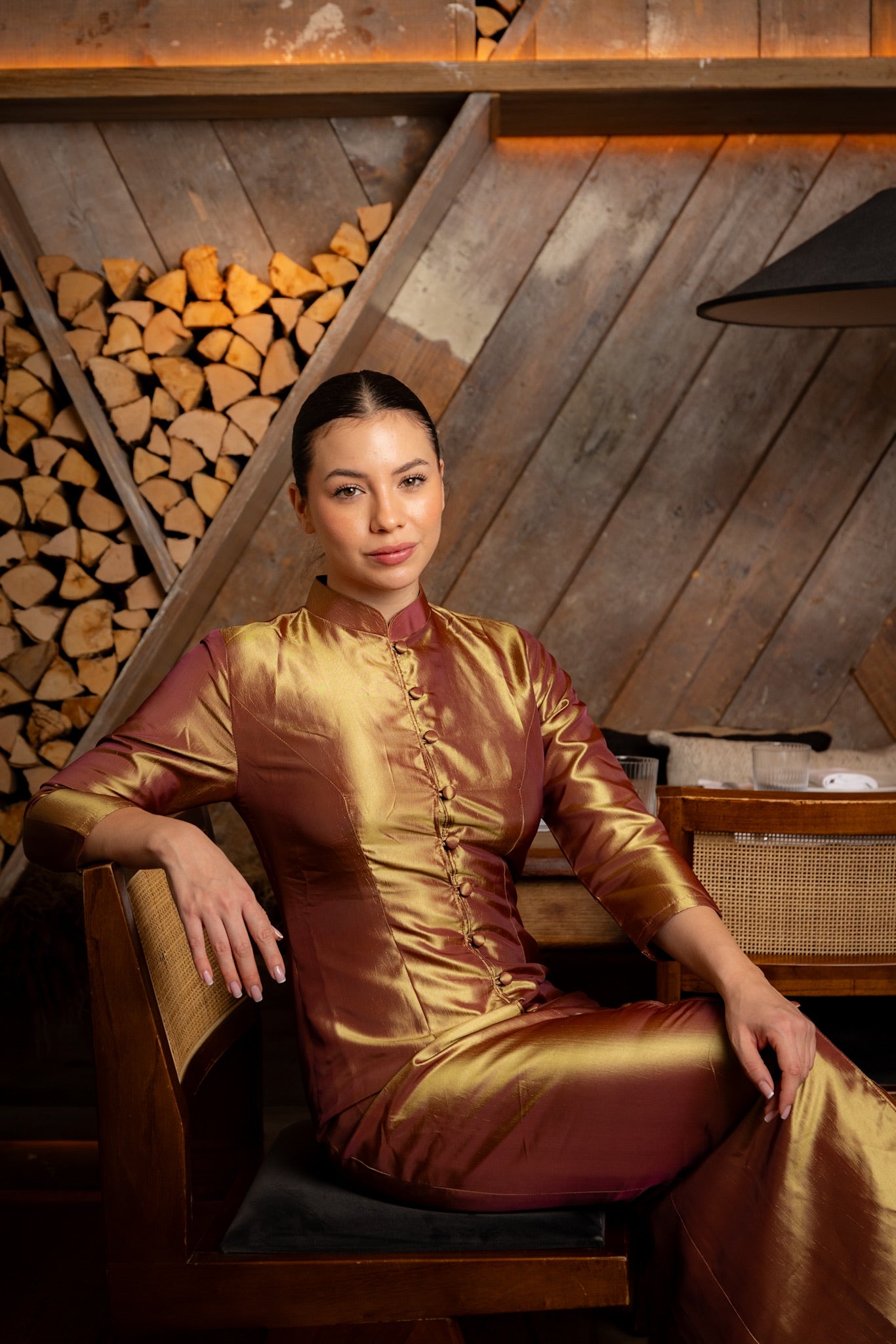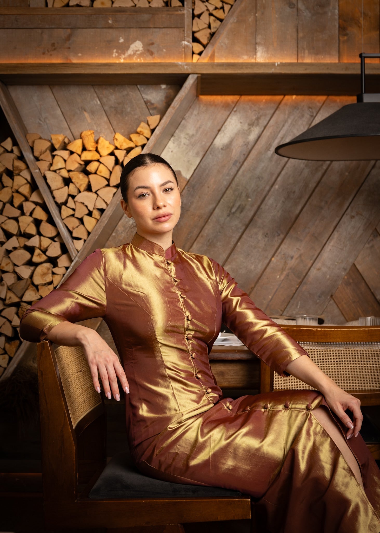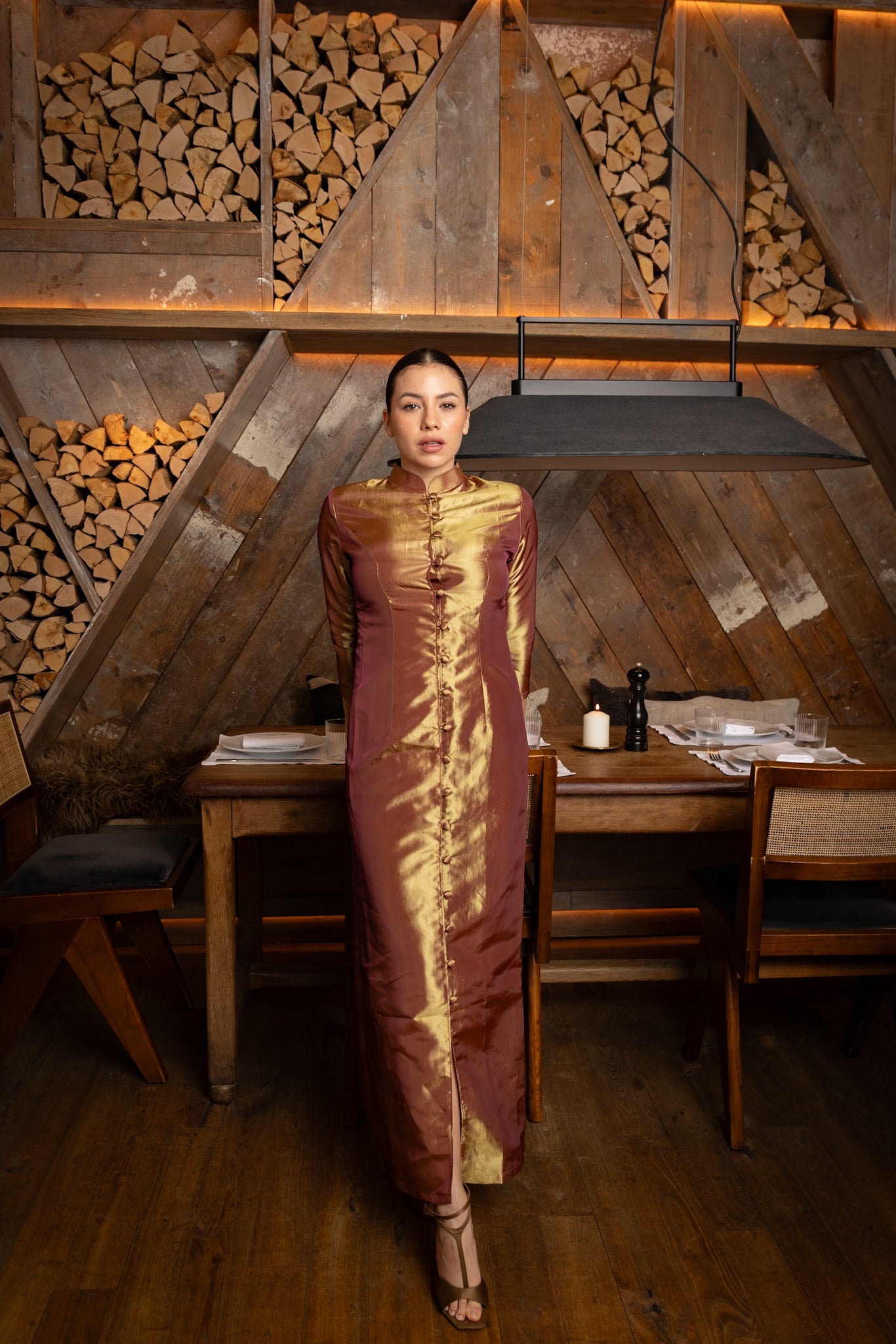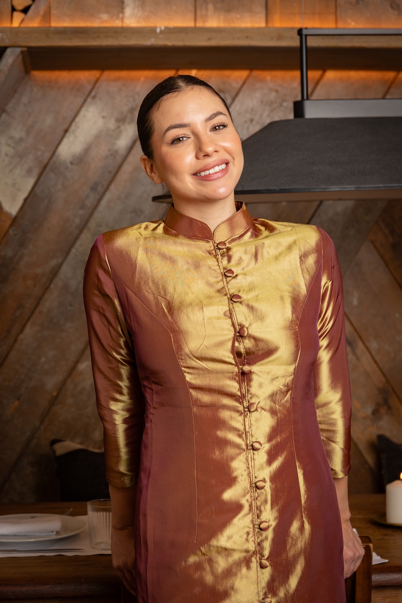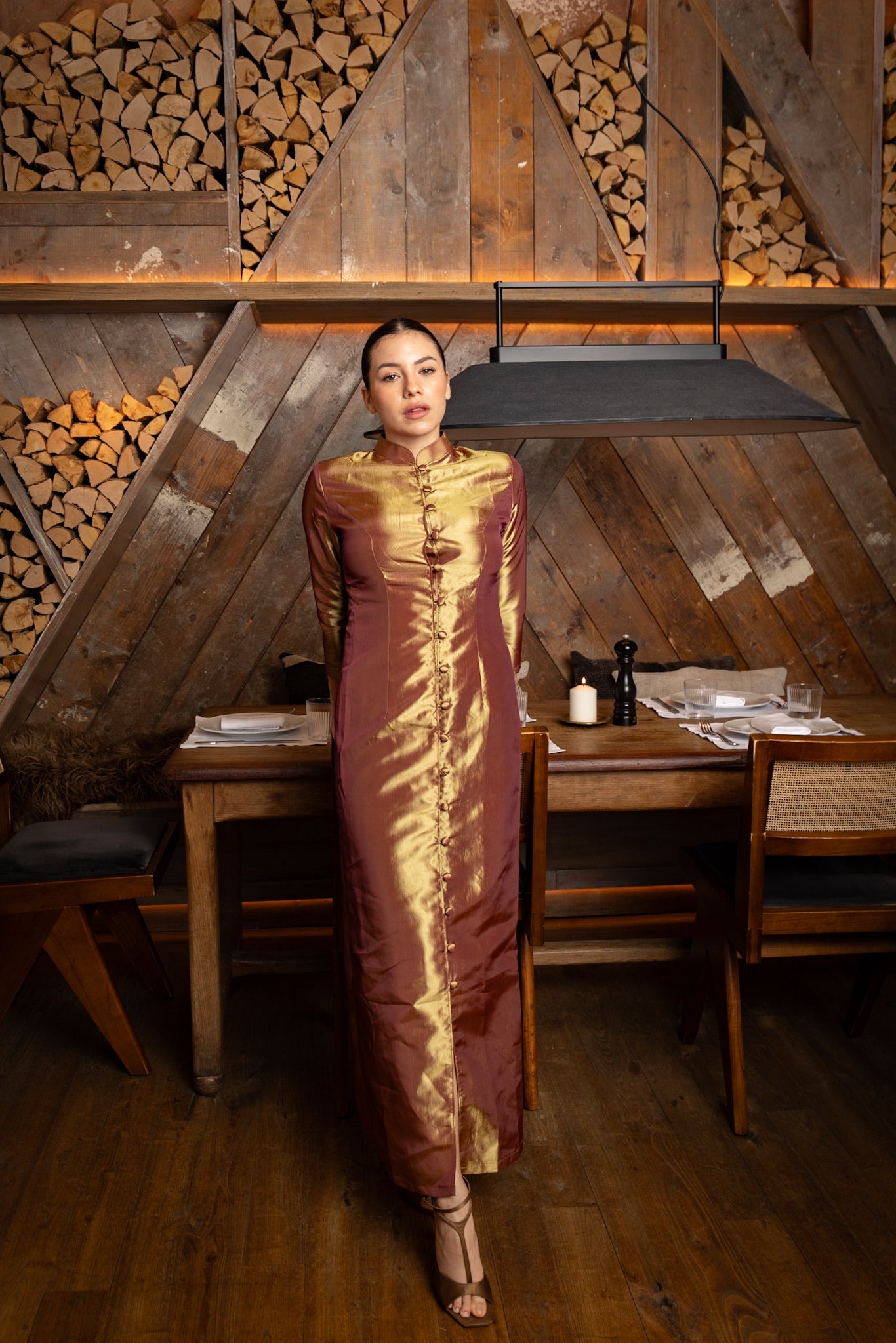 El vestido JULIETTA en color veres pistacho está confeccionado en seda tornasolada, con cuello mao y una elegante hilera central de botones. Su caída fluida y el forro interior aportan movimiento y comodidad con una manga 3/4.