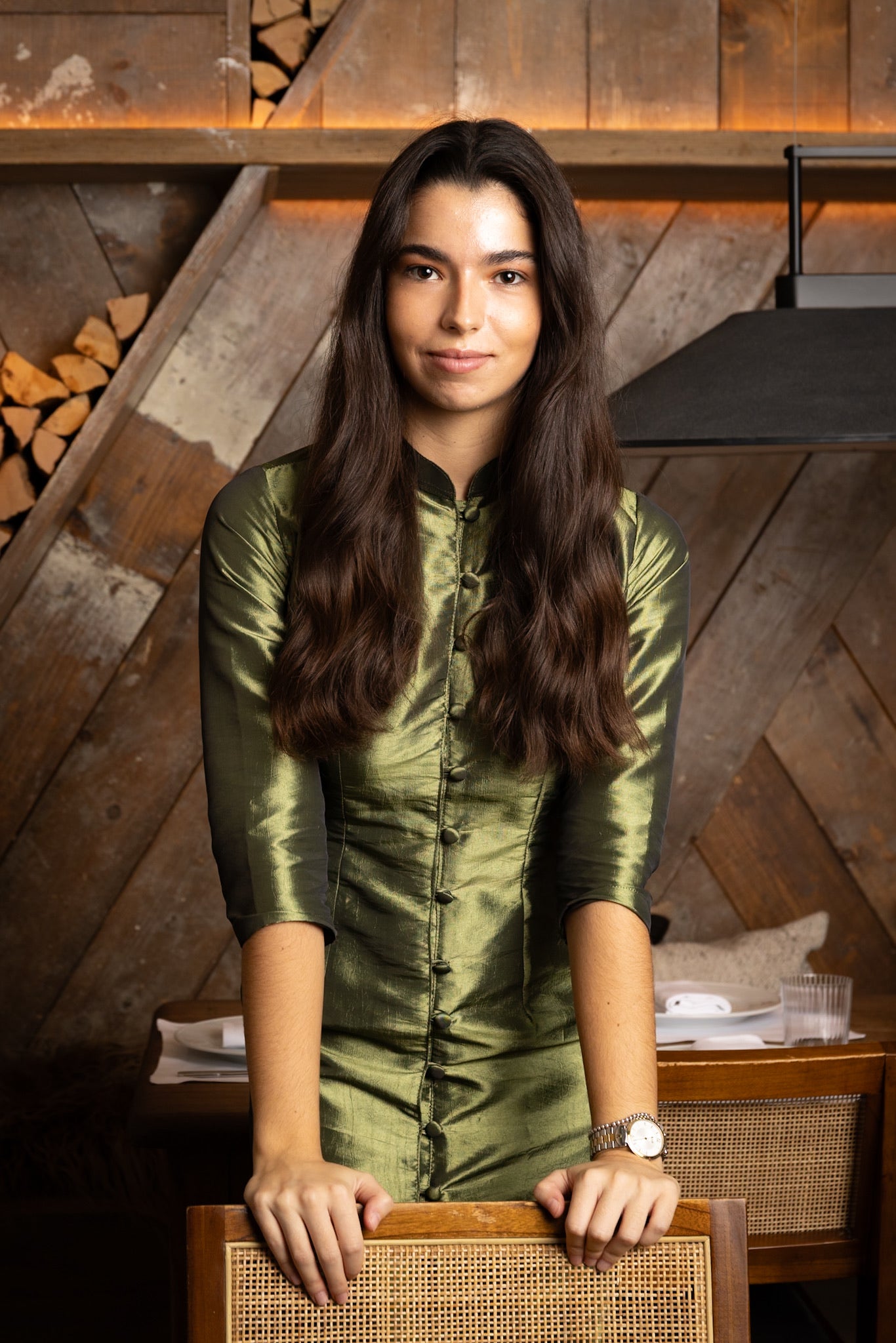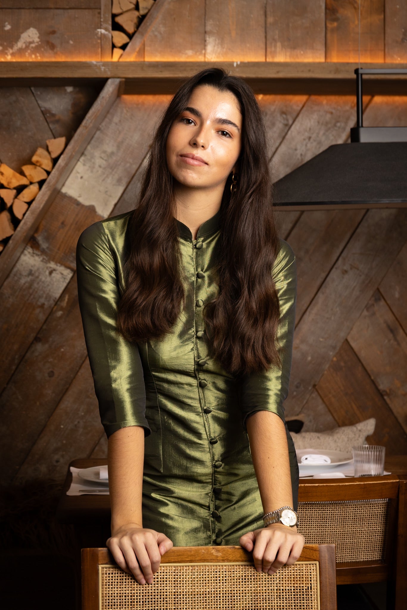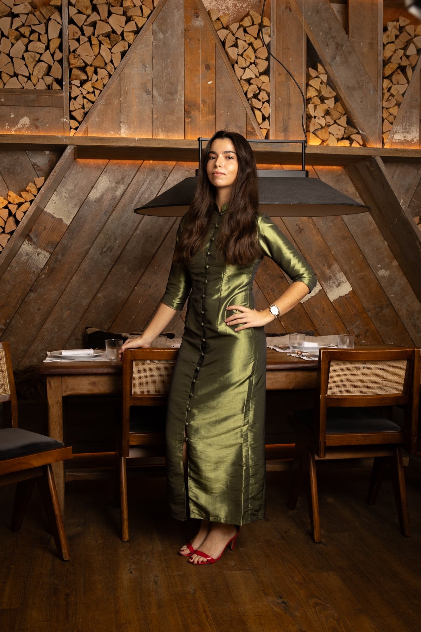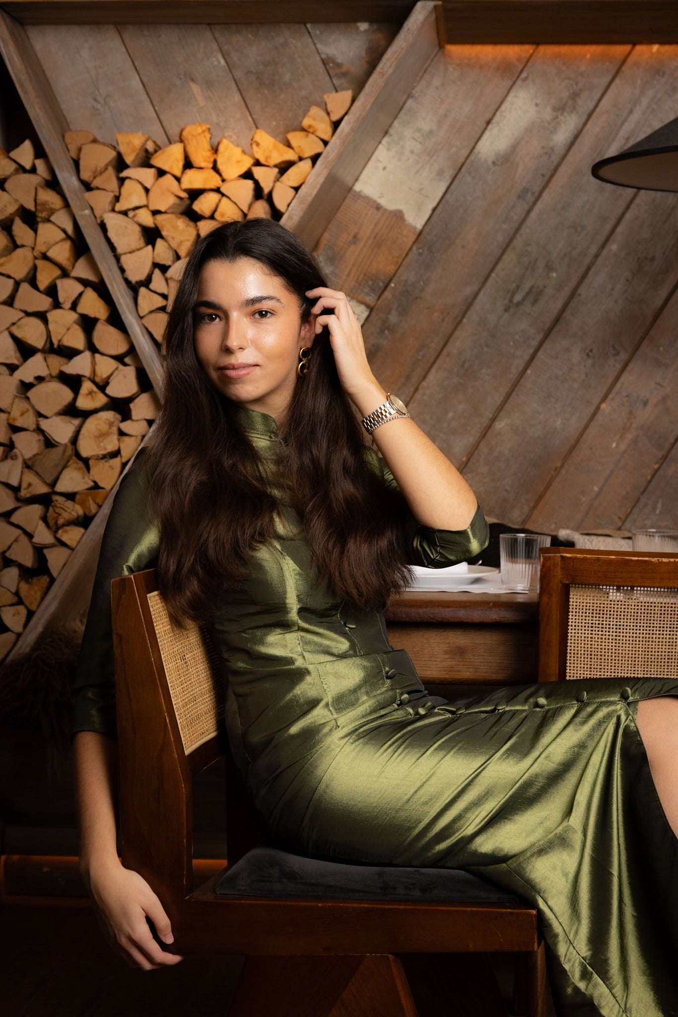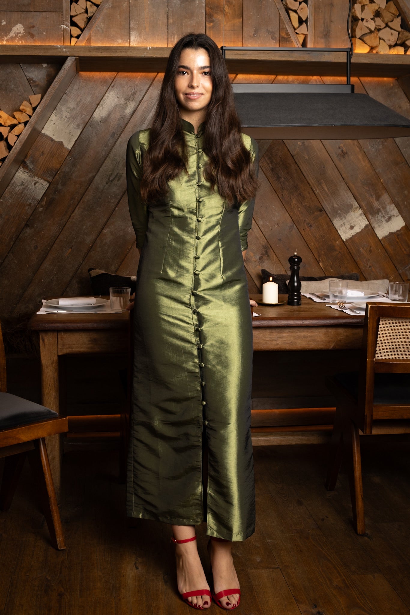 El vestido JULIETTA en color veres pistacho está confeccionado en seda tornasolada, con cuello mao y una elegante hilera central de botones. Su caída fluida y el forro interior aportan movimiento y comodidad con una manga 3/4.